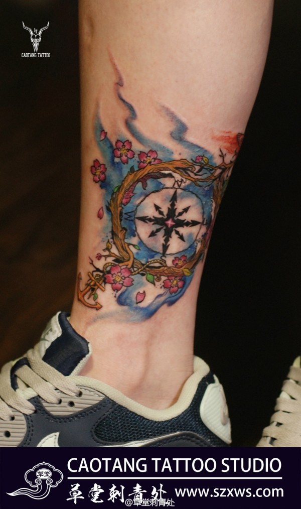 脚部指南针刺青,融合了樱花、船锚、海浪等元素,鲜艳亮丽充满张力