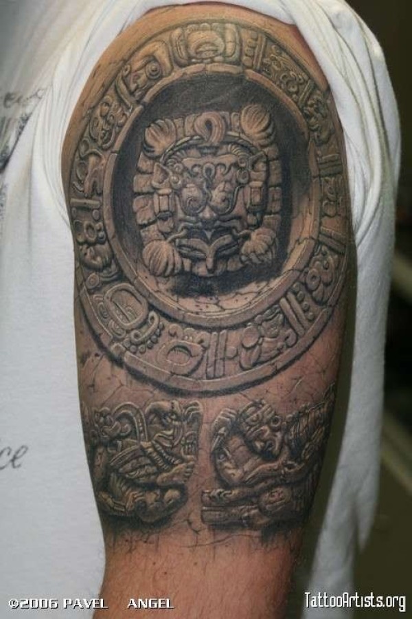 大臂3D写实的阿兹特克石像纹身图案