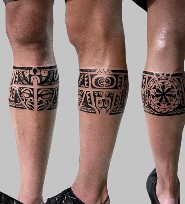 小腿黑色的阿兹特克部落风格图腾纹身图案