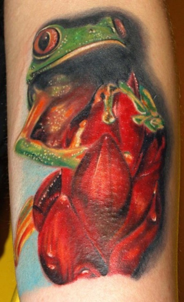 令特别逼真的彩绘青蛙与红色花朵纹身图案