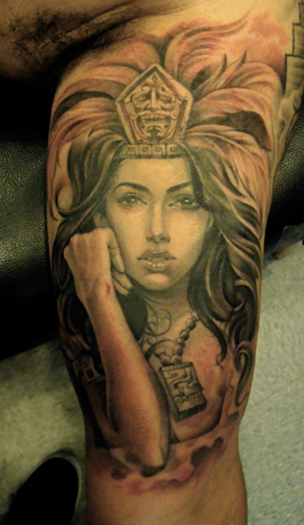 大臂漂亮的阿兹特克女战士肖像纹身图案