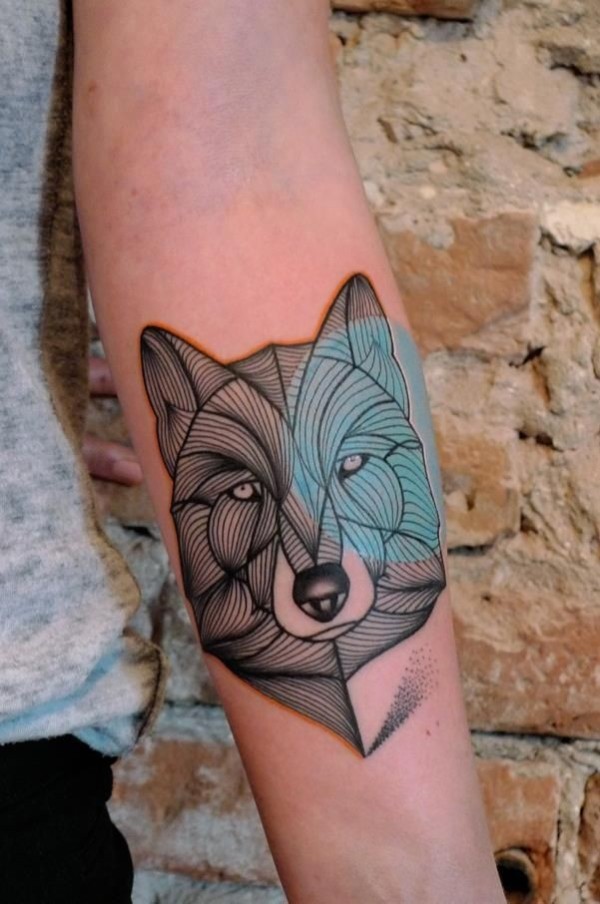 手臂黑色线条狼头和蓝色圆形纹身图案