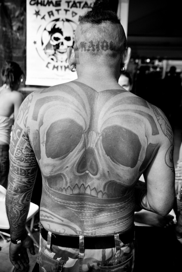 满背黑灰骷髅与线条图腾纹身图案