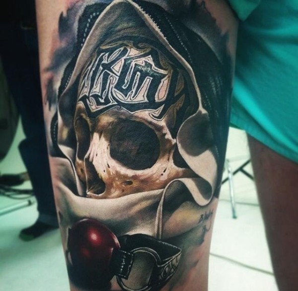 大腿写实的彩绘骷髅字母纹身图案