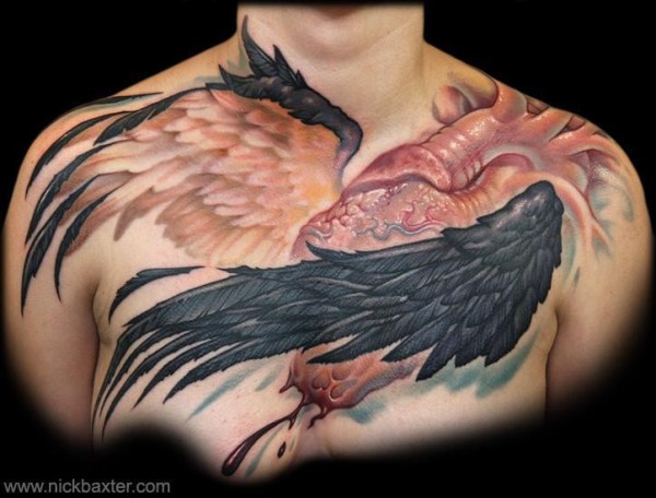 胸部写实风格的鸟的翅膀和心脏彩绘纹身图案