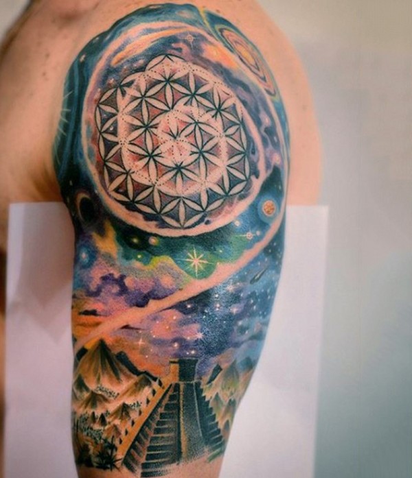 大臂阿兹特克金字塔和浩瀚星空纹身图案