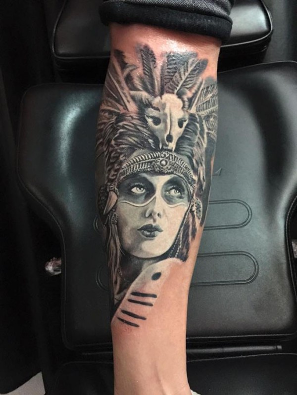 小臂阿兹特克部落女性肖像纹身图案