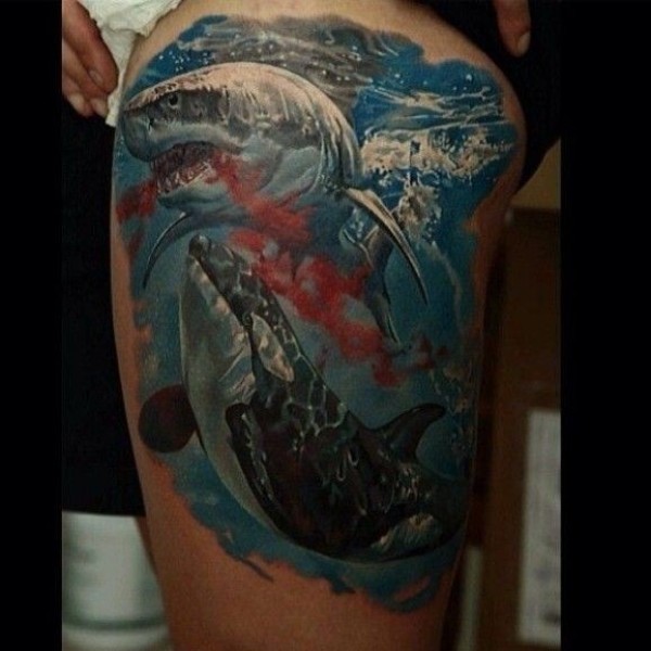 大腿写实可怕的鲨鱼和鲸纹身图案
