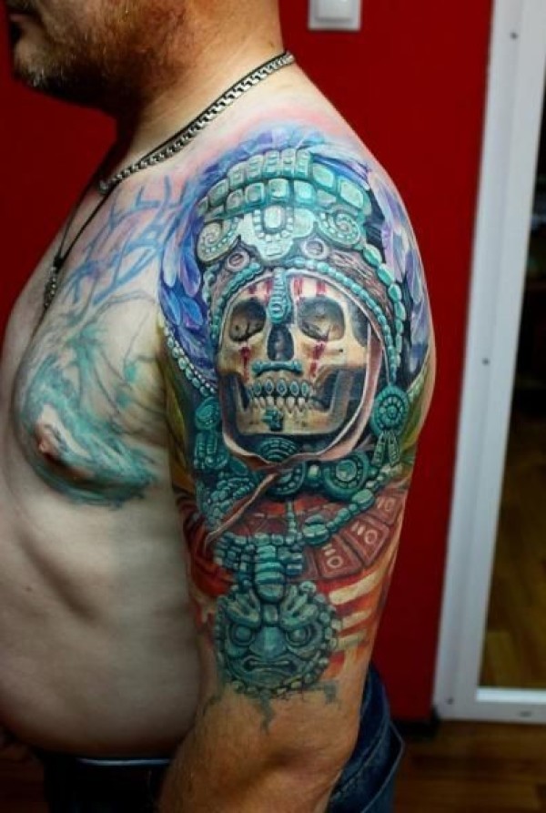 大臂绿松石珠宝和阿兹特克骷髅纹身图案
