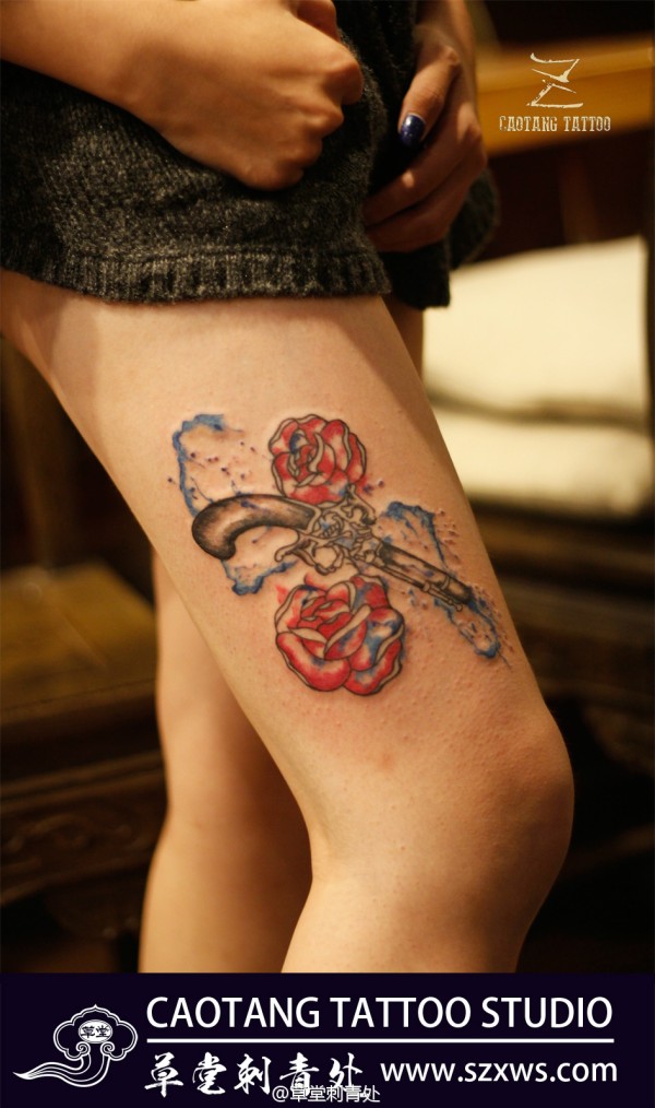 枪的冷峻与玫瑰的娇艳,心有猛虎细嗅蔷薇,美艳的腿部刺青作品