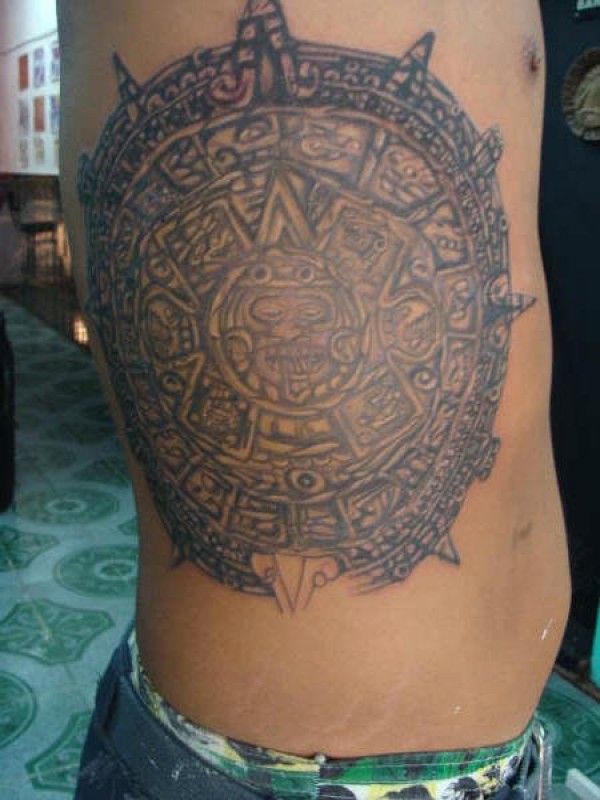 侧肋大面积阿兹特克日历石像纹身图案