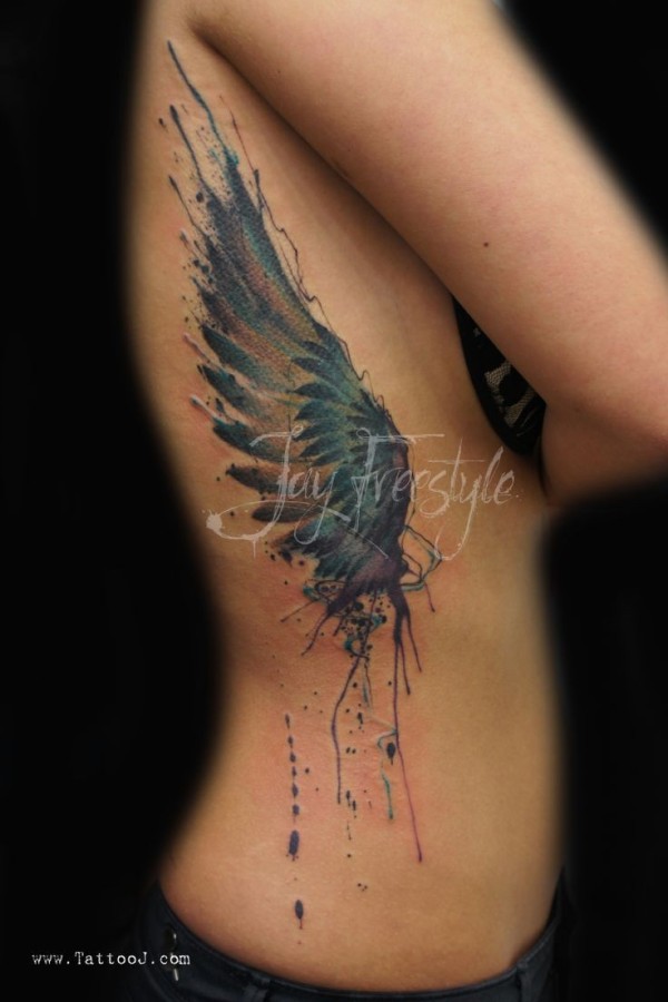 侧肋水彩画风格的彩绘单翅膀纹身图案