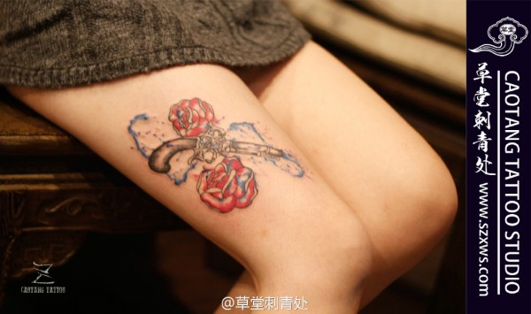 枪的冷峻与玫瑰的娇艳,心有猛虎细嗅蔷薇,美艳的腿部刺青作品