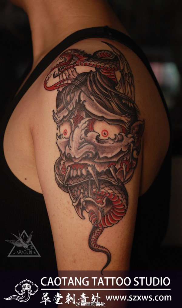【般若&蛇·刺青】般若与蛇的完美结合,大臂刺青作品。