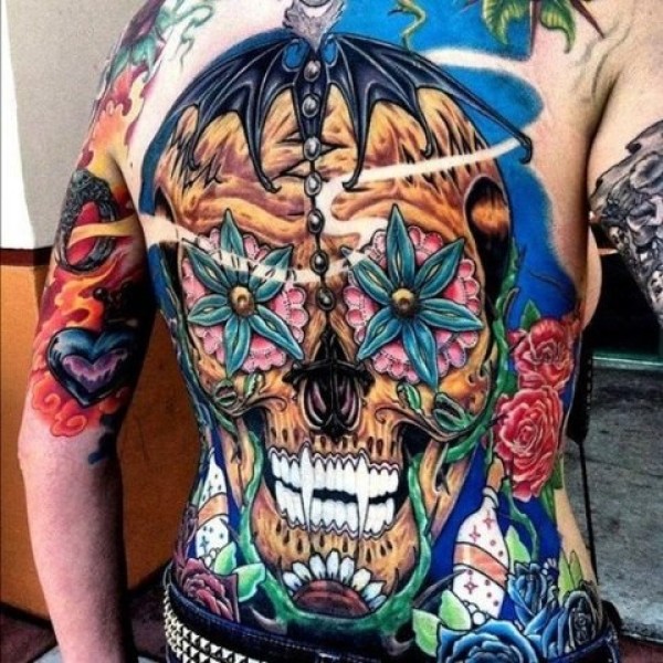 背部彩色鲜艳的骷髅花朵组合纹身图案