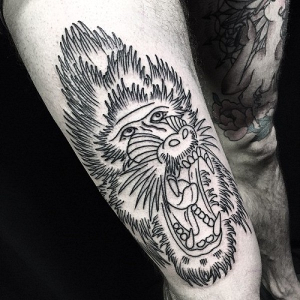 大腿黑白线条狒狒头像纹身图案