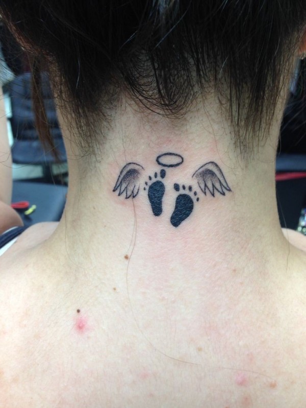 颈部漂亮小宝宝脚印和翅膀纹身图案