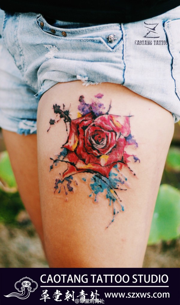 秾艳尽怜胜彩绘,嘉名谁赠作玫瑰。大腿泼墨玫瑰刺青。