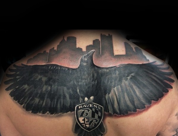 背部黑灰风格的乌鸦和徽章标志纹身图案