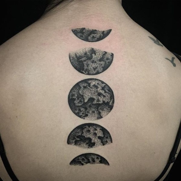 雕刻风格黑色点刺月球不同状态背部纹身图案