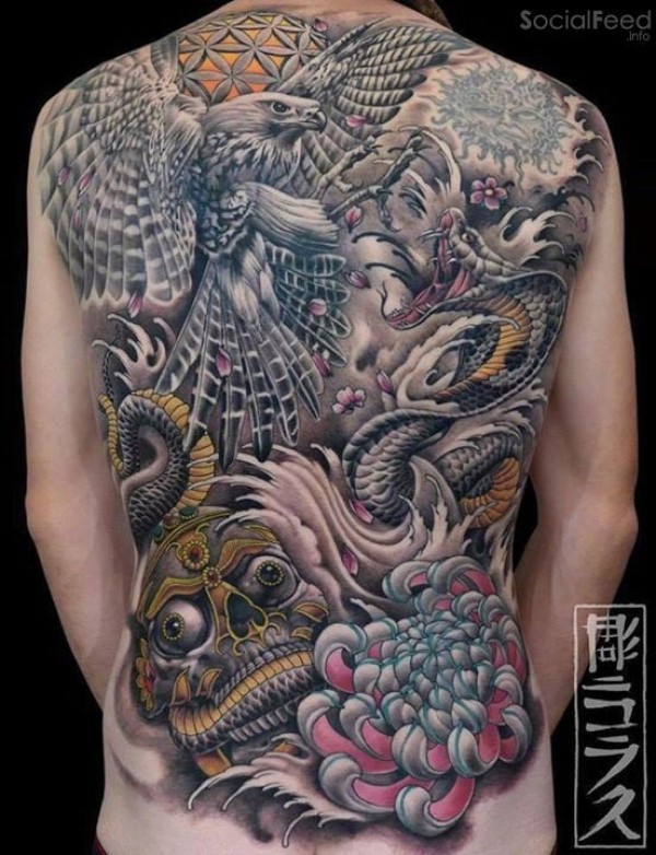 满背漂亮的彩绘蛇老鹰和花朵纹身图案