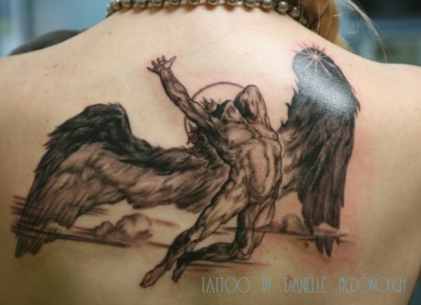 背部黑灰风格的落伊卡洛斯纹身图案