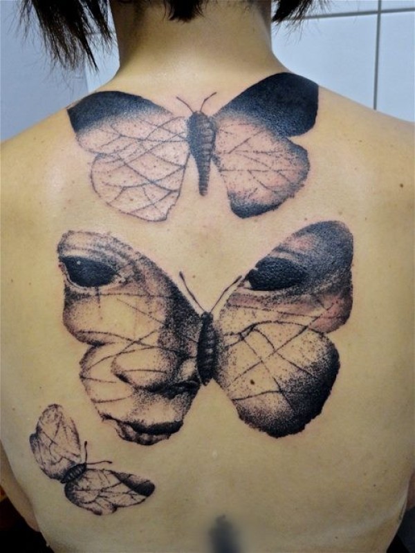 背部点刺风格黑色的蝴蝶和眼睛纹身图案