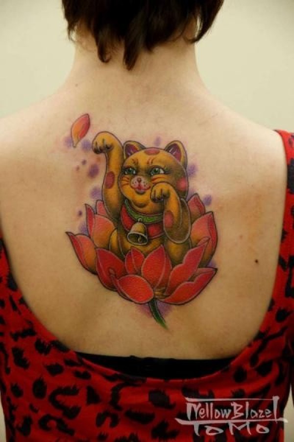 背部彩色的新传统风格可爱猫与花朵纹身图案