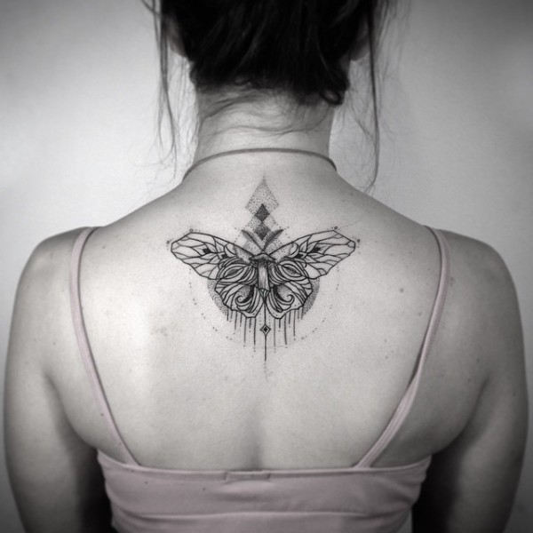 点刺风格背部黑色蝴蝶几何饰品纹身图案
