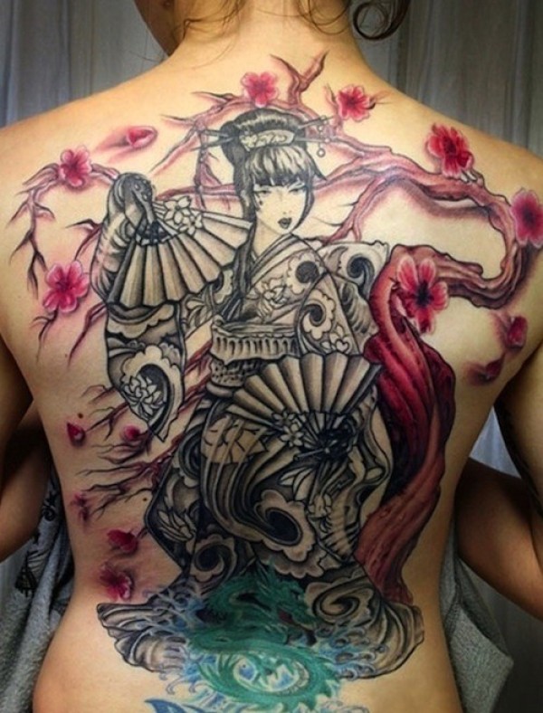 背部日本风格彩色的艺妓樱花纹身图案