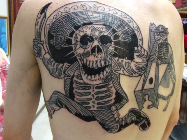 雕刻风格黑色线条墨西哥骷髅背部纹身图案