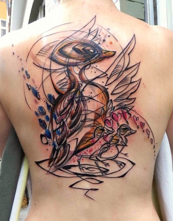 背部素描式的彩色可爱小鸟家族纹身图案