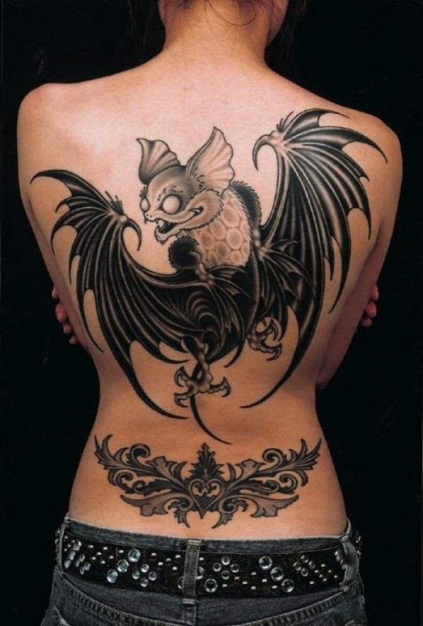 背部搞笑的蝙蝠个性黑灰纹身图案