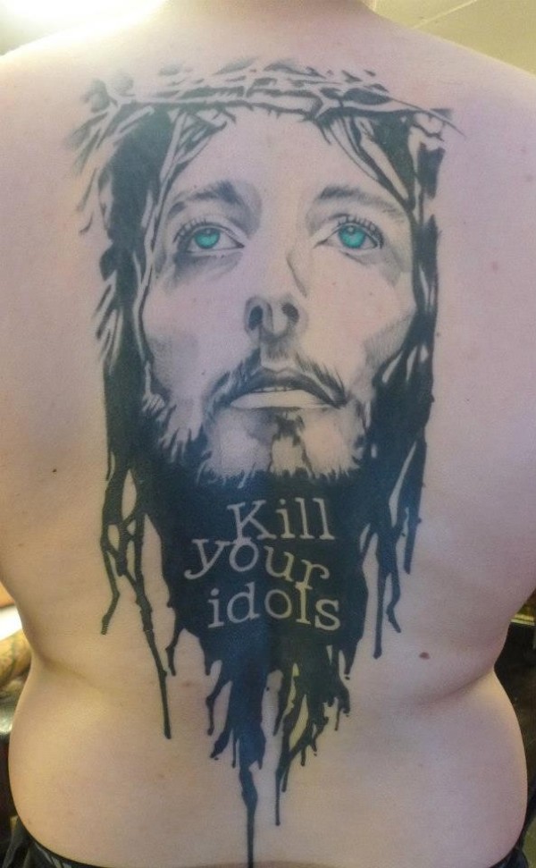 背部现代风格的彩色耶稣画像字母纹身图案
