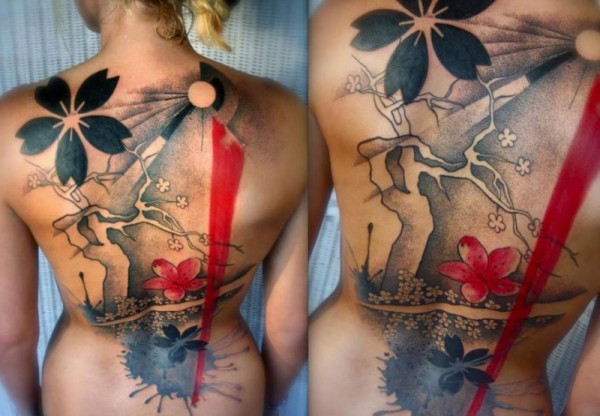 背部新日式彩色美丽的花朵和树纹身图案