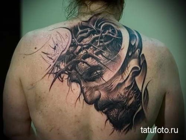 黑灰风格背部耶稣肖像藤蔓纹身图案