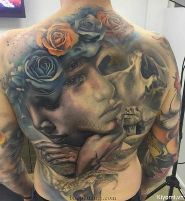 背部新传统风格彩色女人脸与骷髅和玫瑰纹身图案