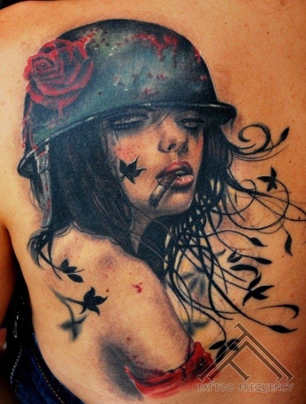 背部彩色的吸烟性感女人与玫瑰纹身图案