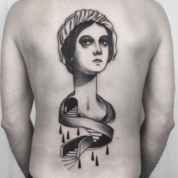 背部超现实主义风格黑色点刺女人楼梯纹身图案
