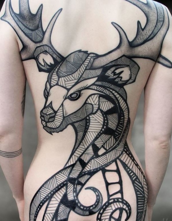背部精美的黑色线条点刺鹿与饰品纹身图案