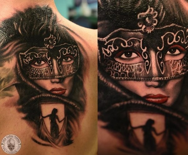 背部戴面具的神秘女性纹身图案