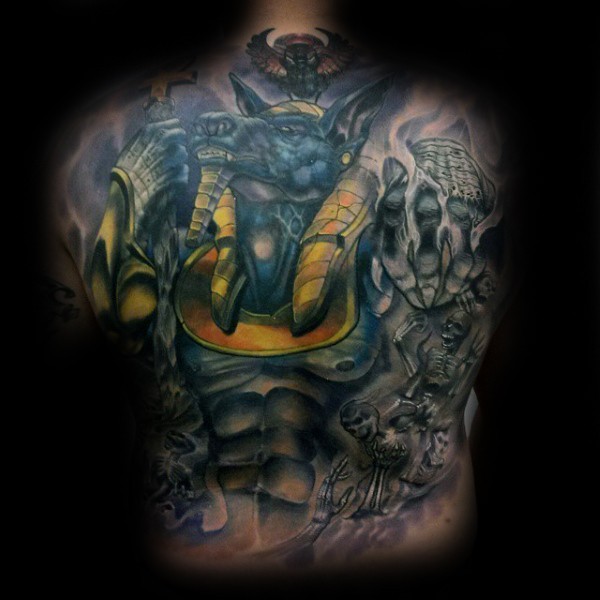 背部彩色的骷髅和阿努比斯神像纹身图案