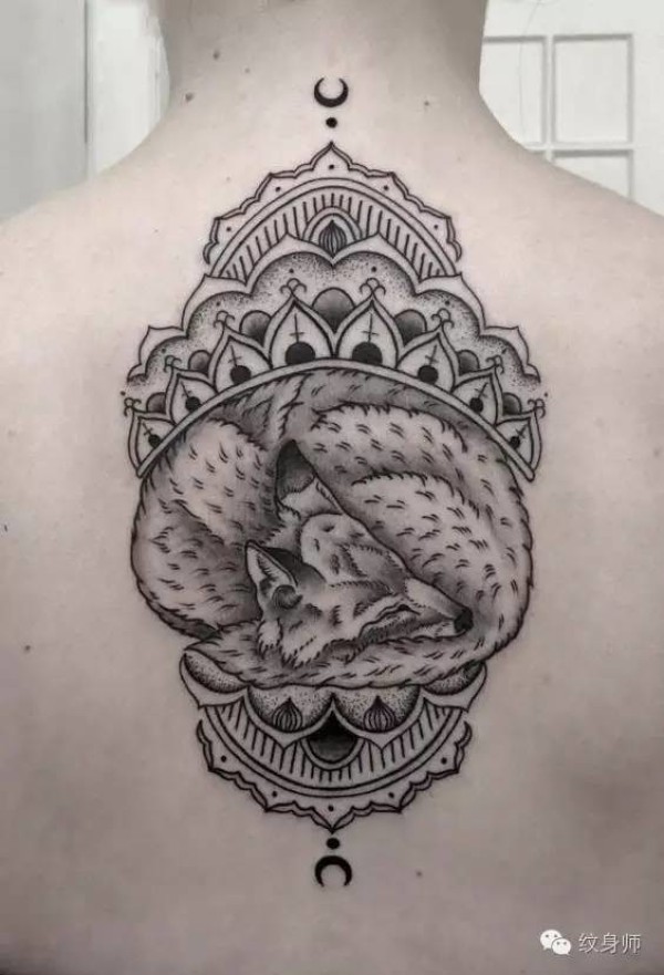 背部点刺风格黑色的睡觉狐狸和梵花纹身图案