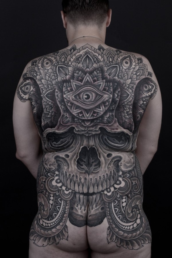 背部古代骷髅与各种装饰品和眼睛纹身图案