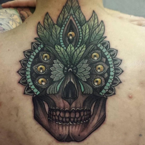 背部彩色的人类骷髅与羽毛纹身图案