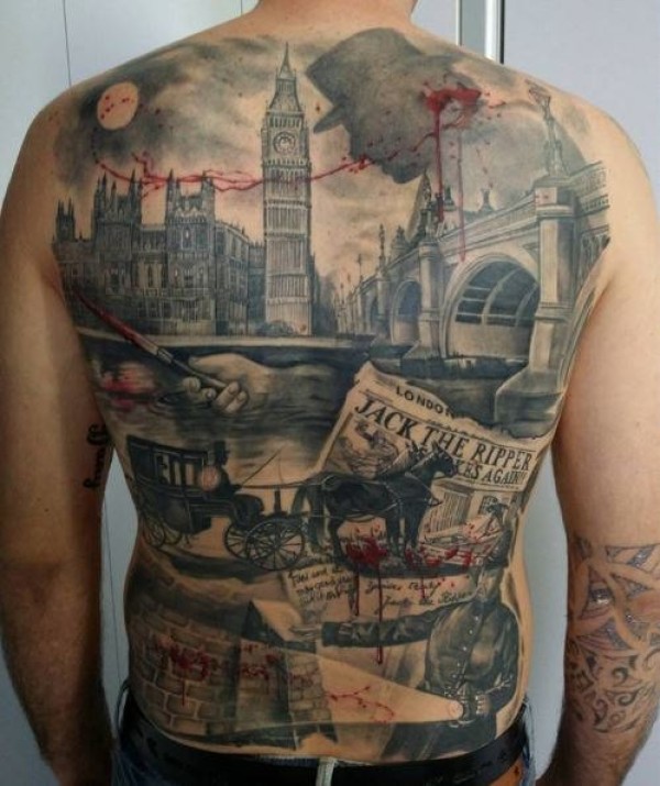 背部写实风格血腥疯狂的中世纪伦敦纹身图案