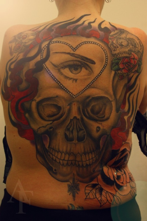 背部彩绘骷髅与心形眼睛和火焰纹身图案