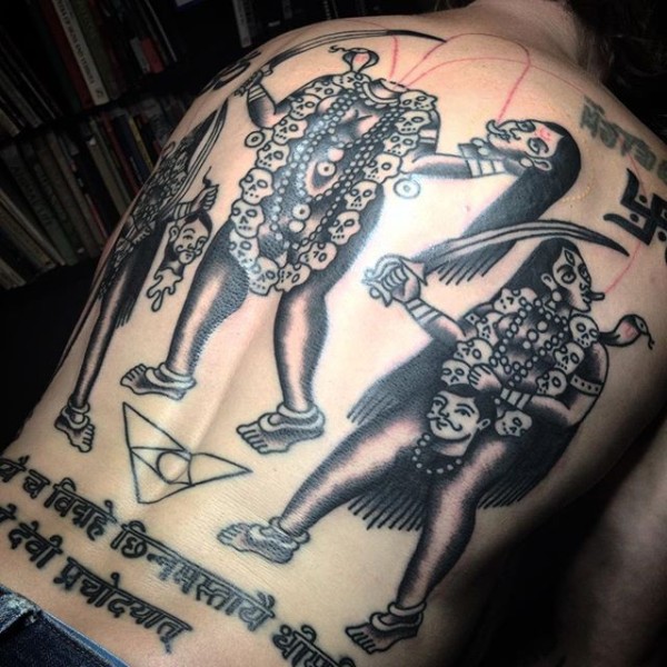 背部自制式的恐怖女子和骷髅黑灰纹身图案