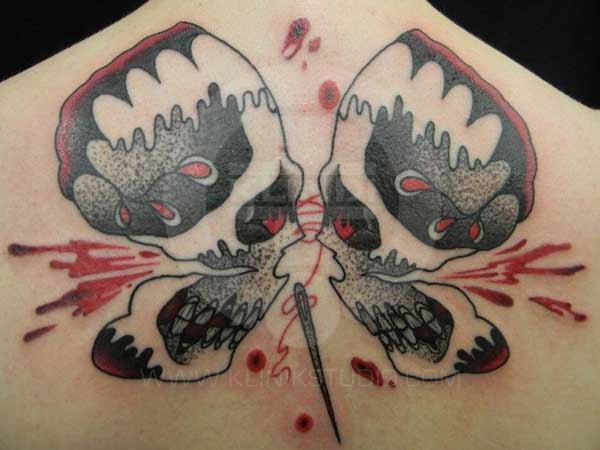 背部old school彩色蝴蝶形状的骷髅纹身图案