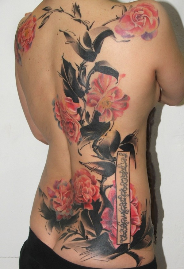 背部漂亮的彩色美丽花朵和字符纹身图案